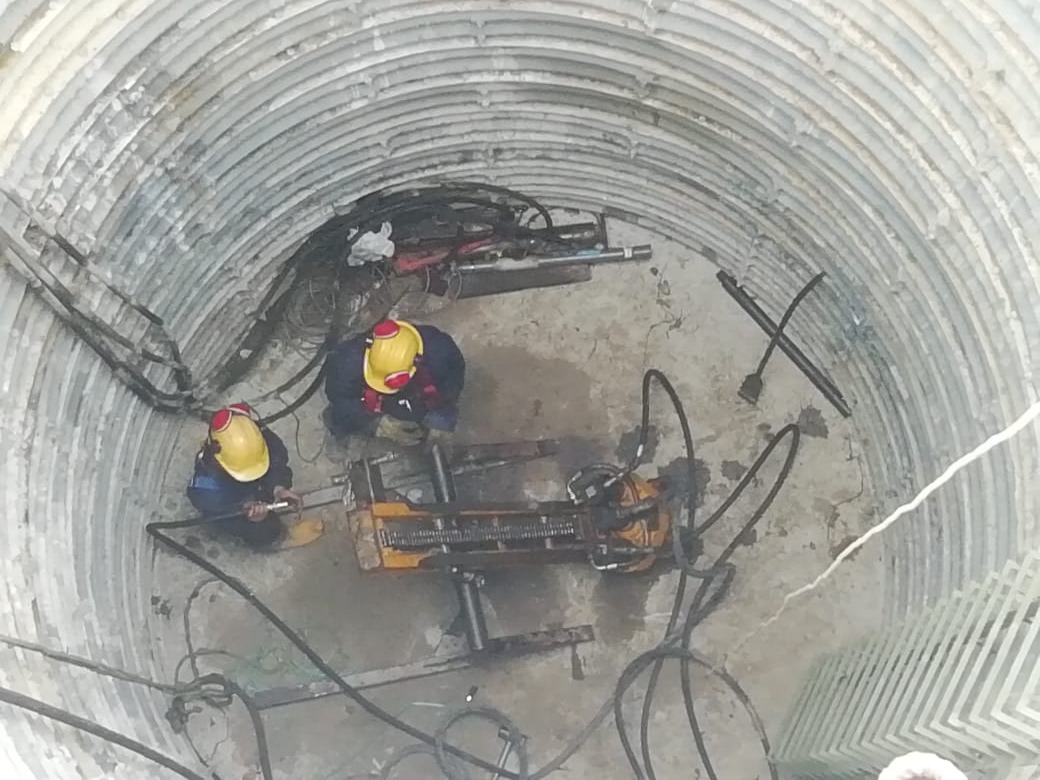 Construcción de micropilotes de 30m de longitud, dentro de los Caissons para el reforzamiento de la cimentación de las pilas centrales del puente.